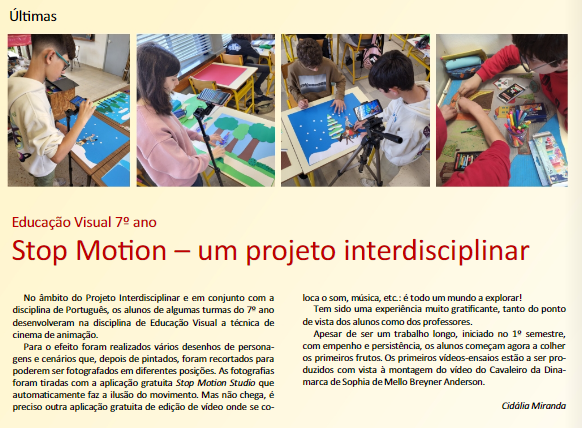 Ao longo do presente ano letivo de 2022-23, o Externato de Penafirme desenvolveu um projeto interdisciplinar para alunos do 7.º Ano, que integrou as áreas de Português e Educação Visual, com vista a desenvolver competências dos alunos em técnicas de cinema de animação. No dizer da professora Cidália Miranda, foi «uma experiência muito gratificante, tanto do ponto de vista dos alunos como dos professores». Aqui deixamos algumas imagens e a reportagem completa gentilmente enviada.